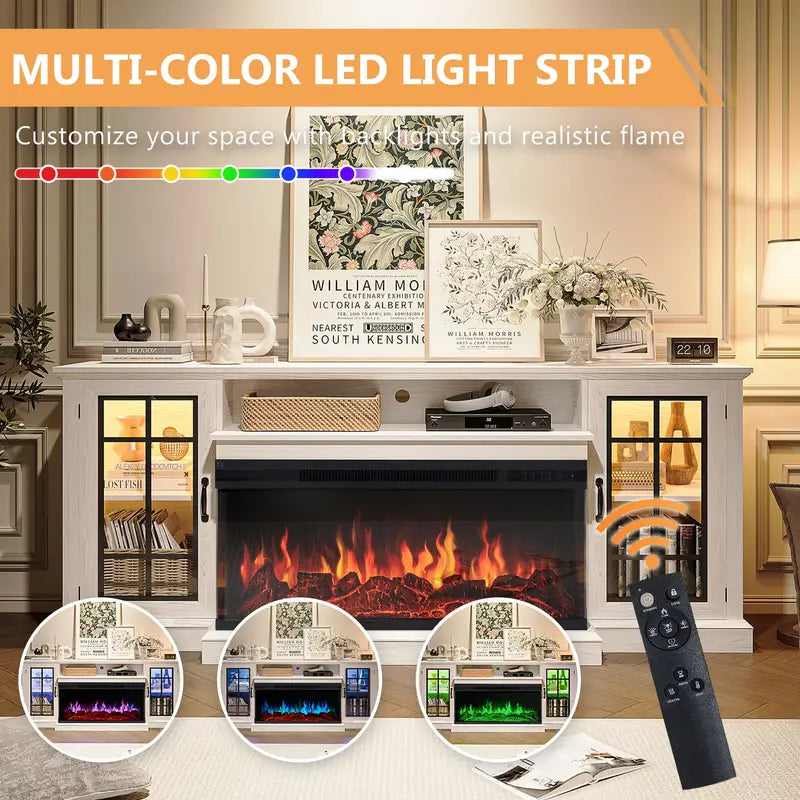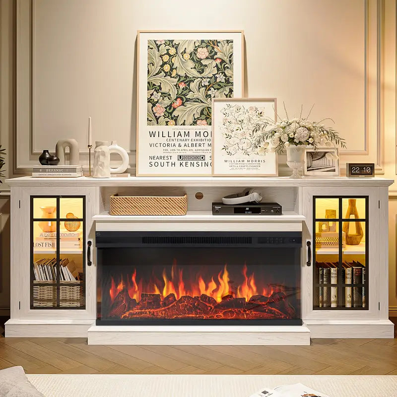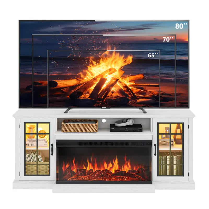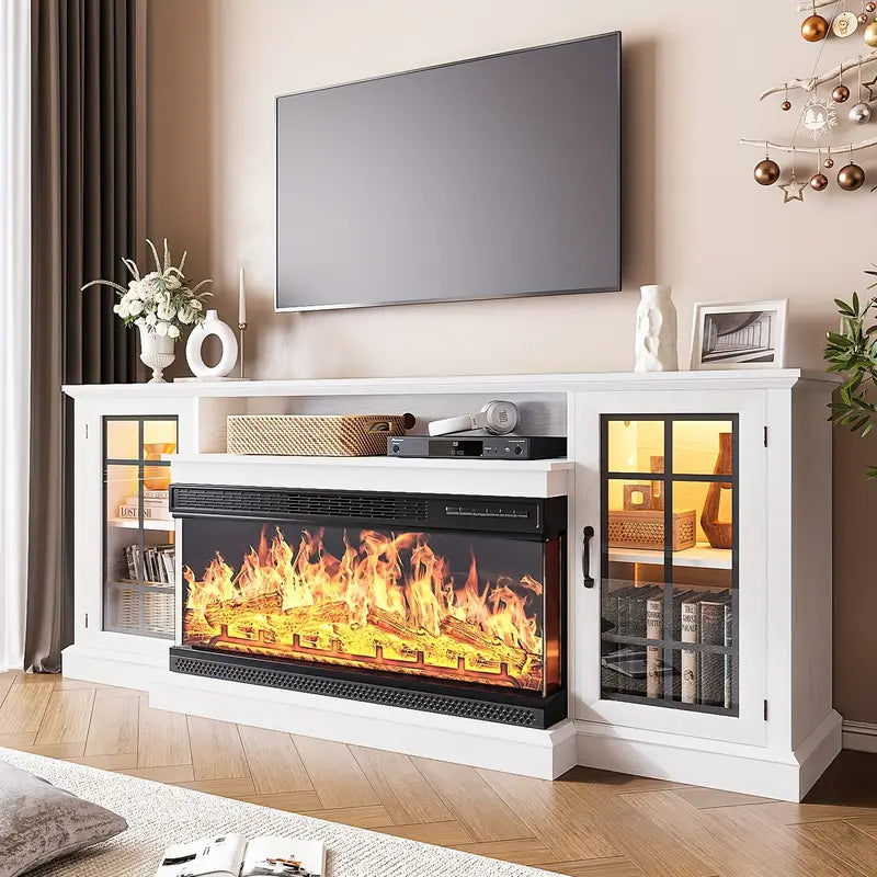 Infuse your living room with the cozy sophistication of this triple-sided glass fireplace TV stand, crafted to capture the spirit of farmhouse living. Made from recycled wood in a soft white and weathered gray finish, it offers a harmonious blend of sustainability and style. The textured surfaces and clean lines evoke the charm of a country cottage while supporting TVs up to 80 inches with effortless grace.