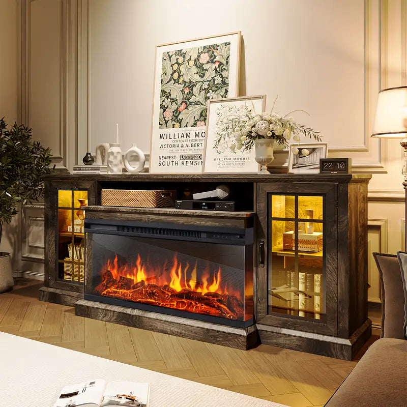 36-Inch Triple-Sided Glass Fireplace TV Stand, Suitable for TVs Under 80 Inches with Storage Cabinet and Glass Door