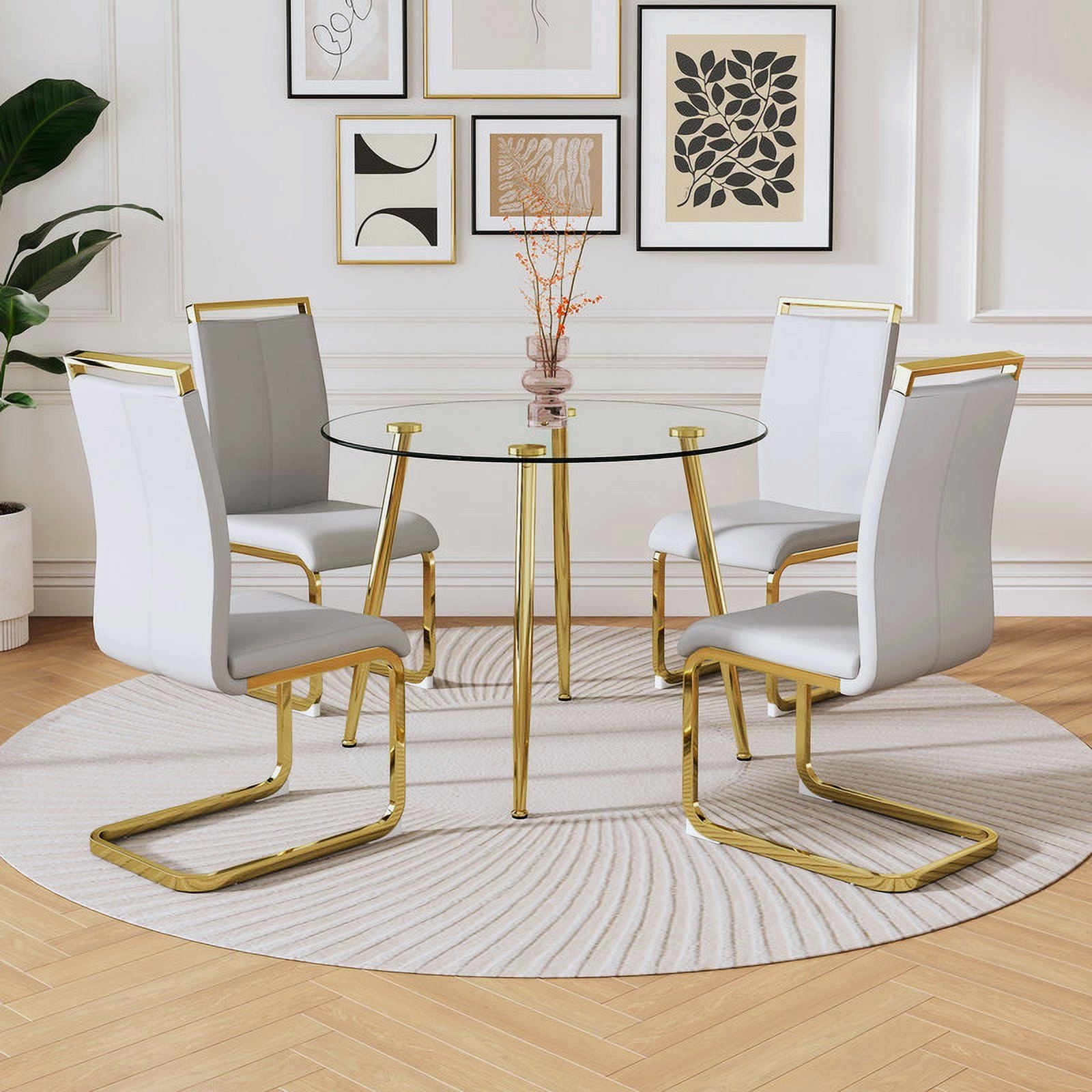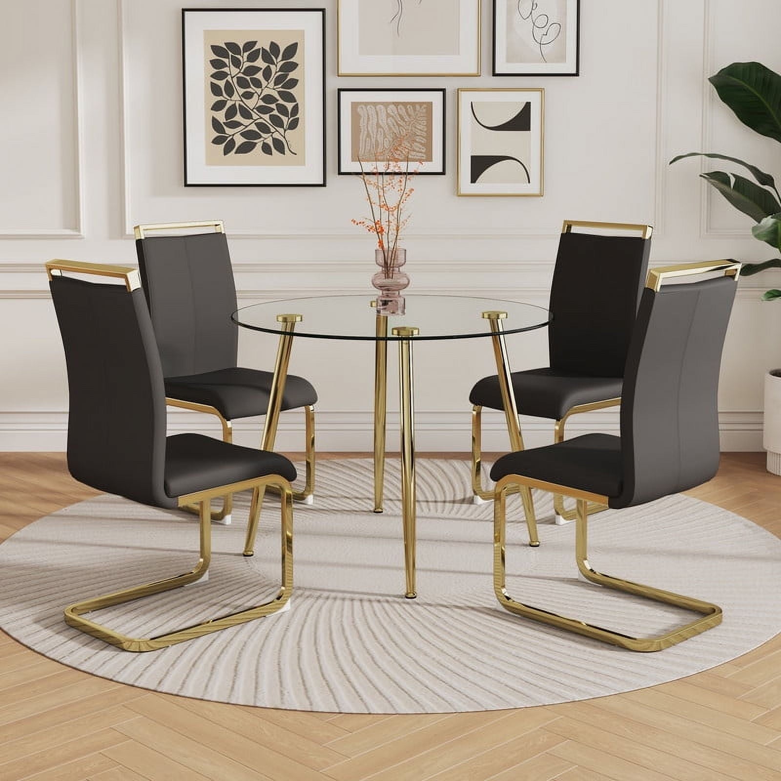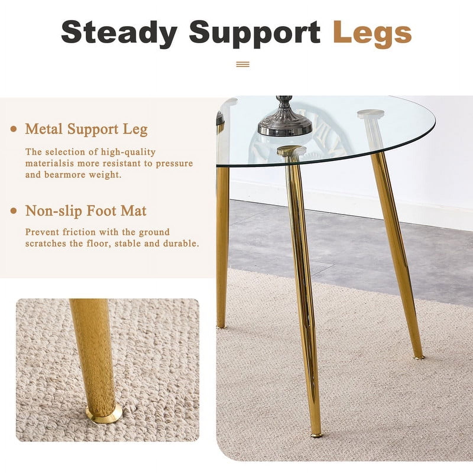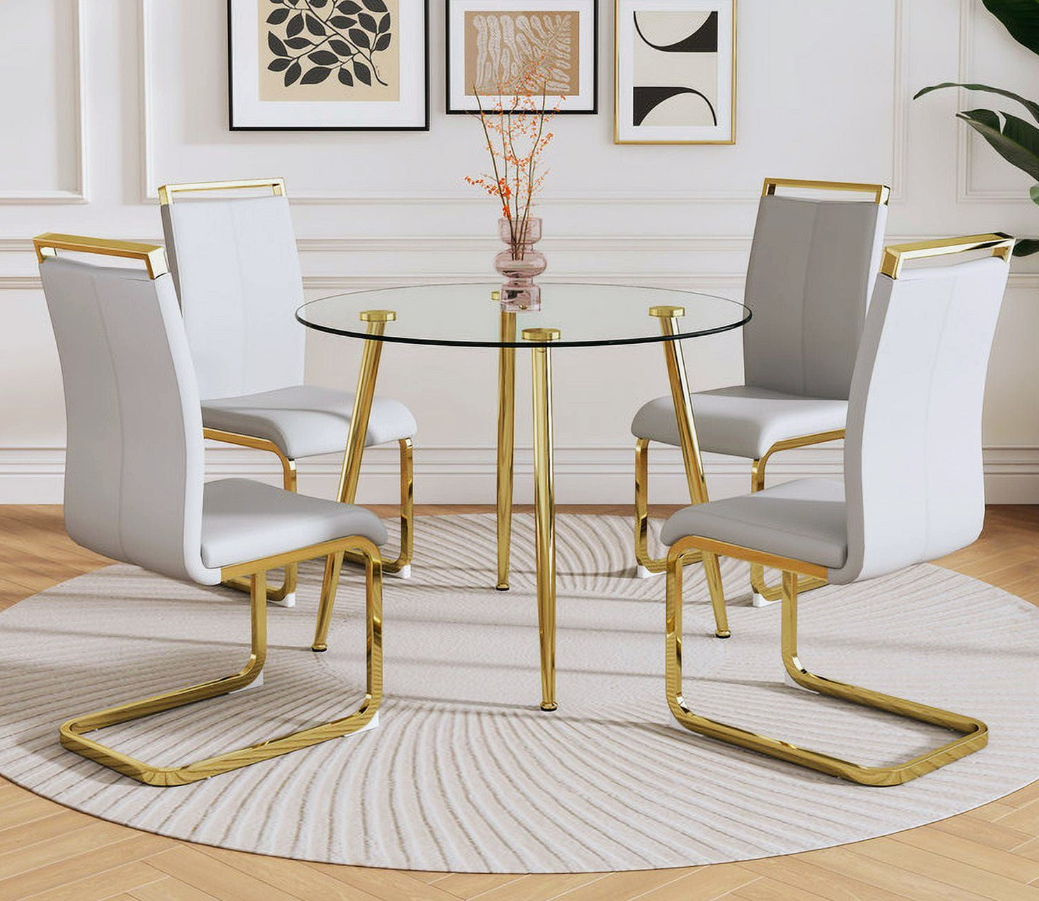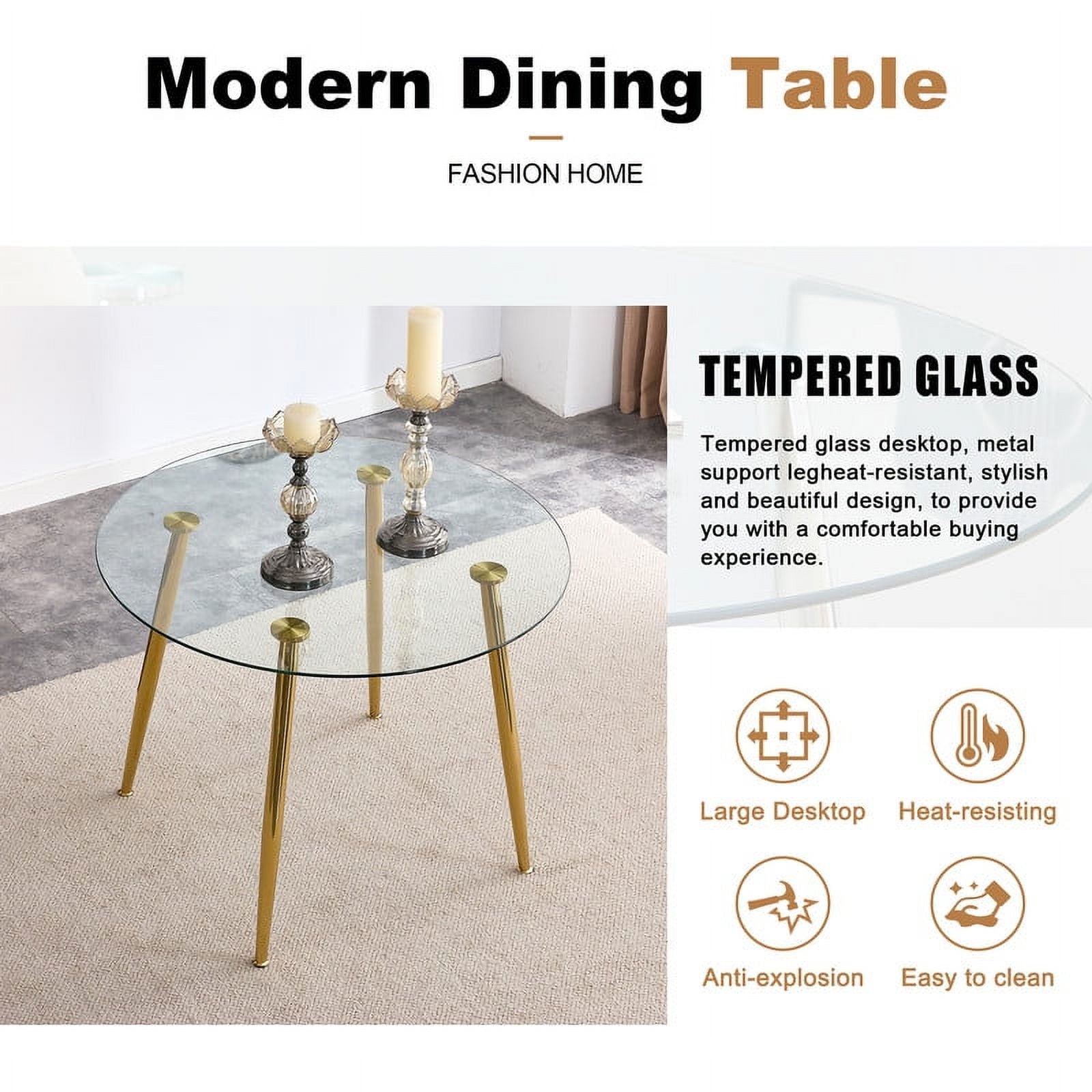 Elevate your dining experience with this modern 5-piece ensemble, thoughtfully designed for intimate gatherings and refined interiors. The centerpiece—a round tempered glass tabletop—rests gracefully atop sleek golden metal legs, offering both visual lightness and structural integrity.