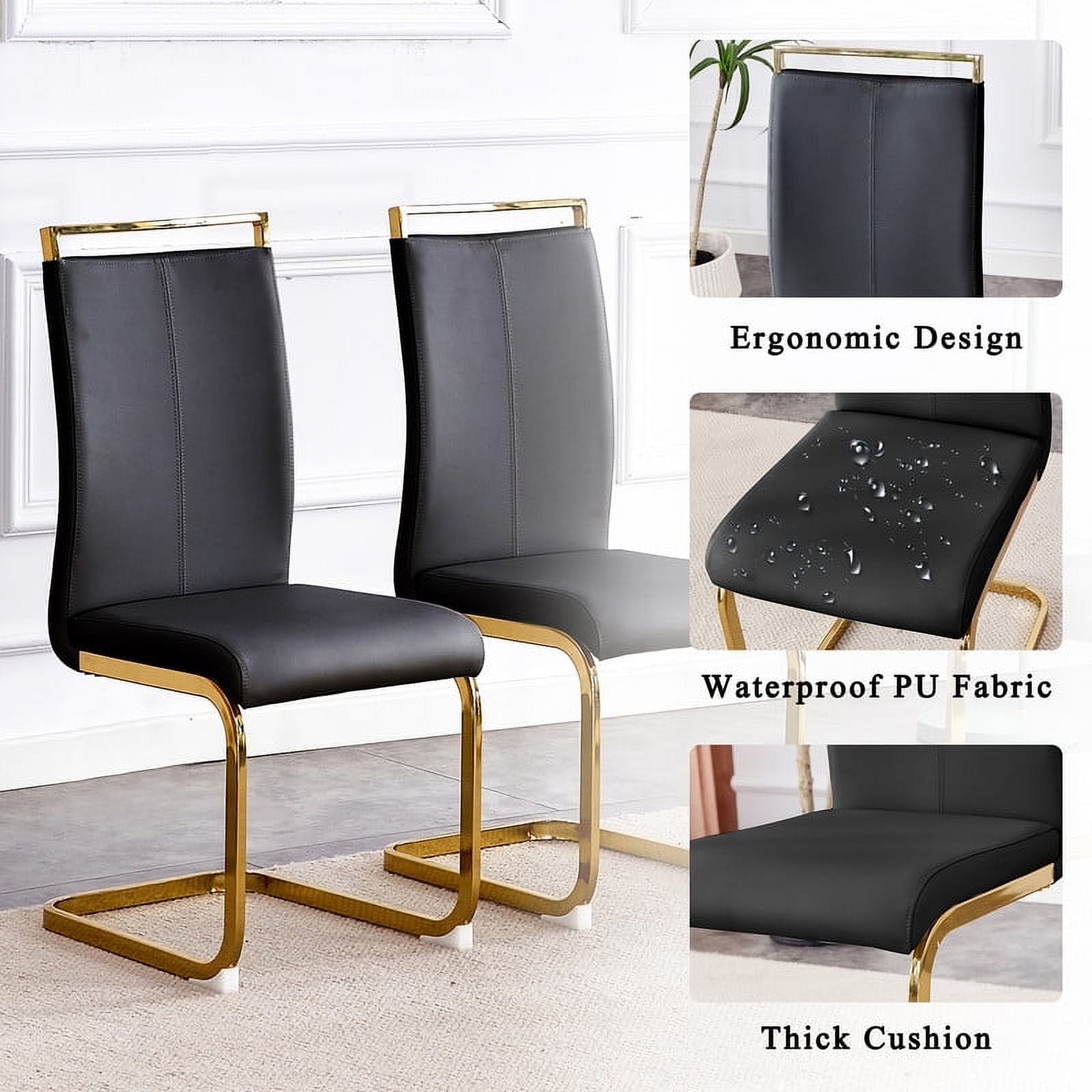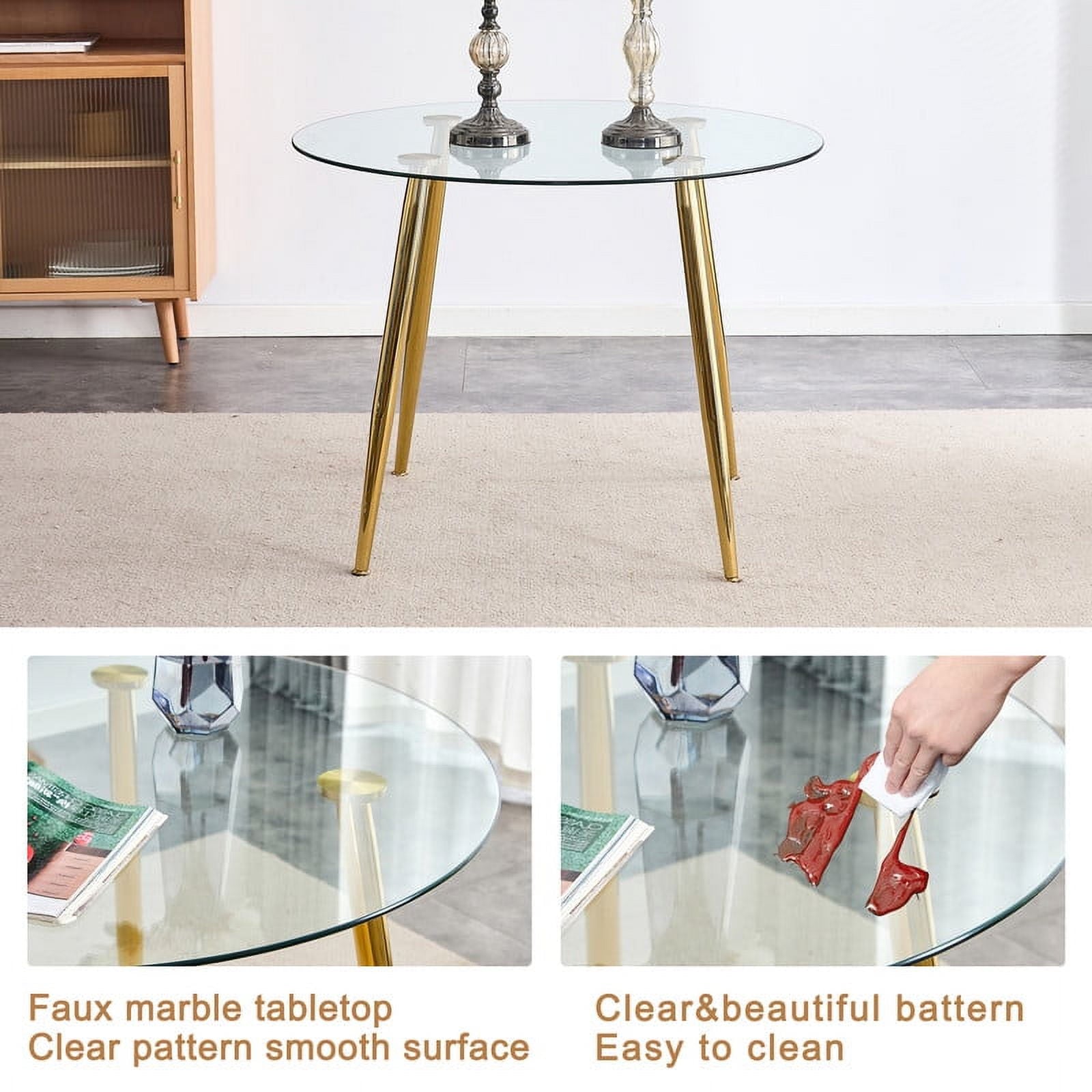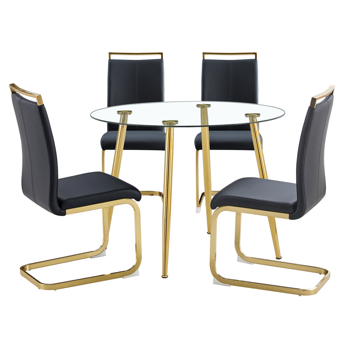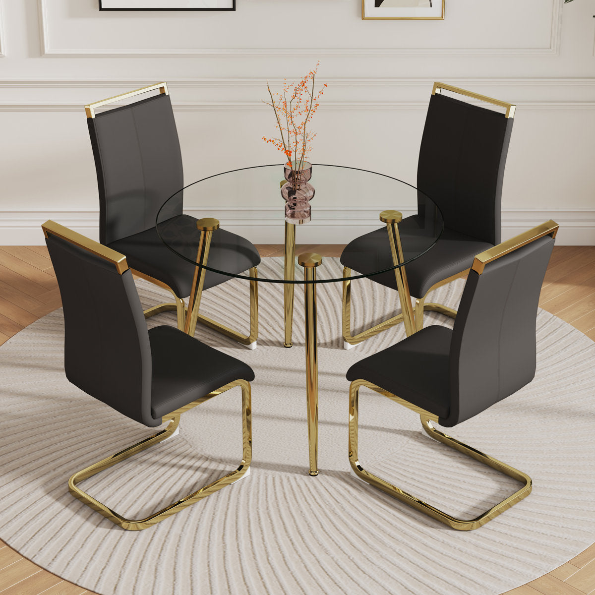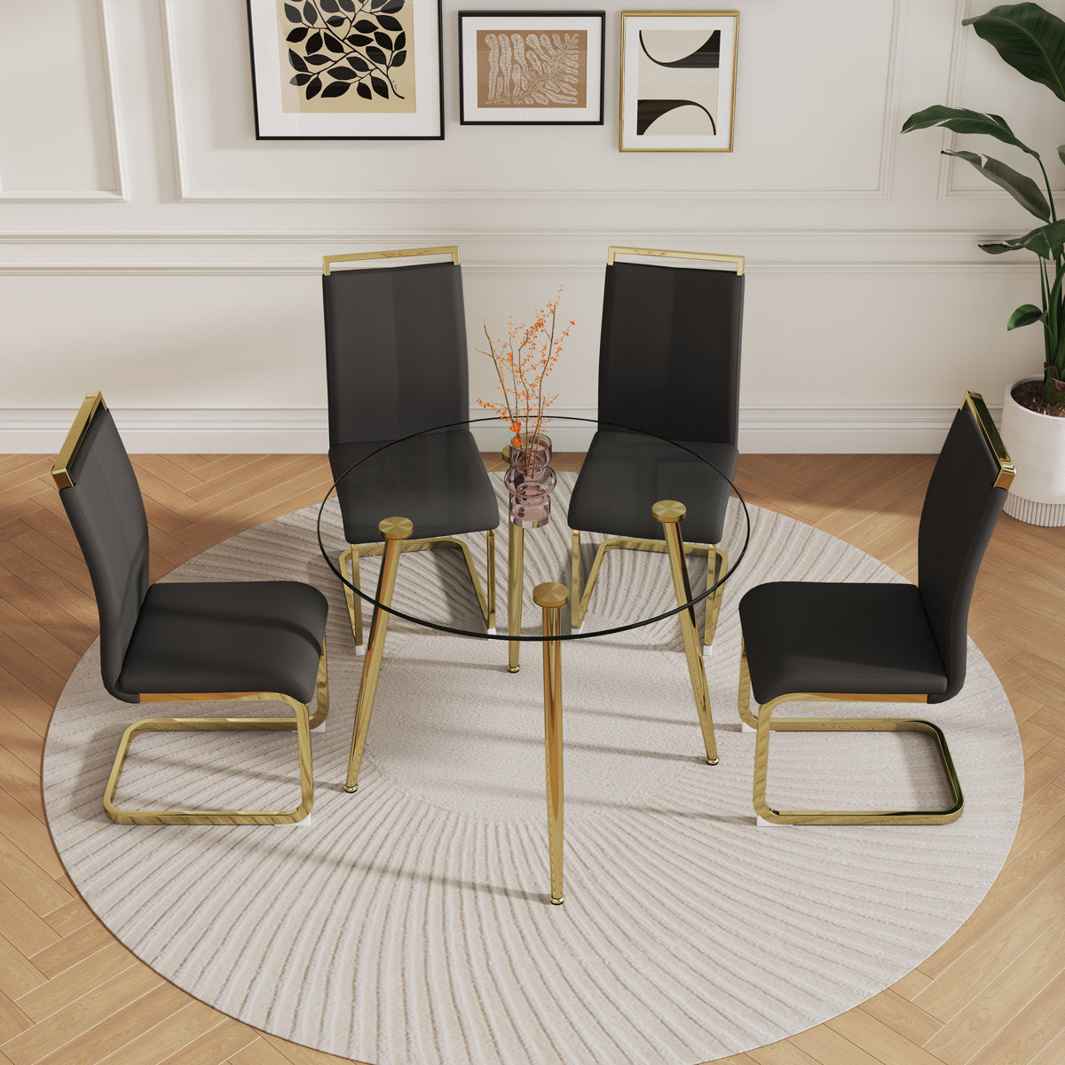 Elevate your dining experience with this modern 5-piece ensemble, thoughtfully designed for intimate gatherings and refined interiors. The centerpiece—a round tempered glass tabletop—rests gracefully atop sleek golden metal legs, offering both visual lightness and structural integrity.