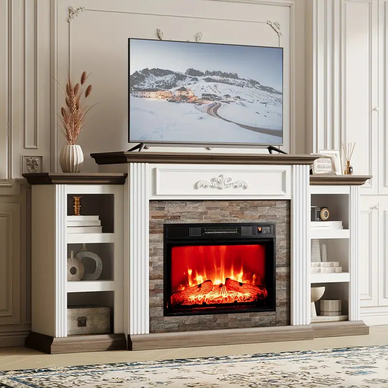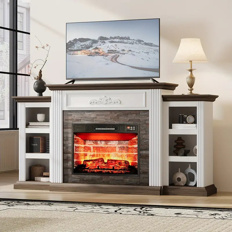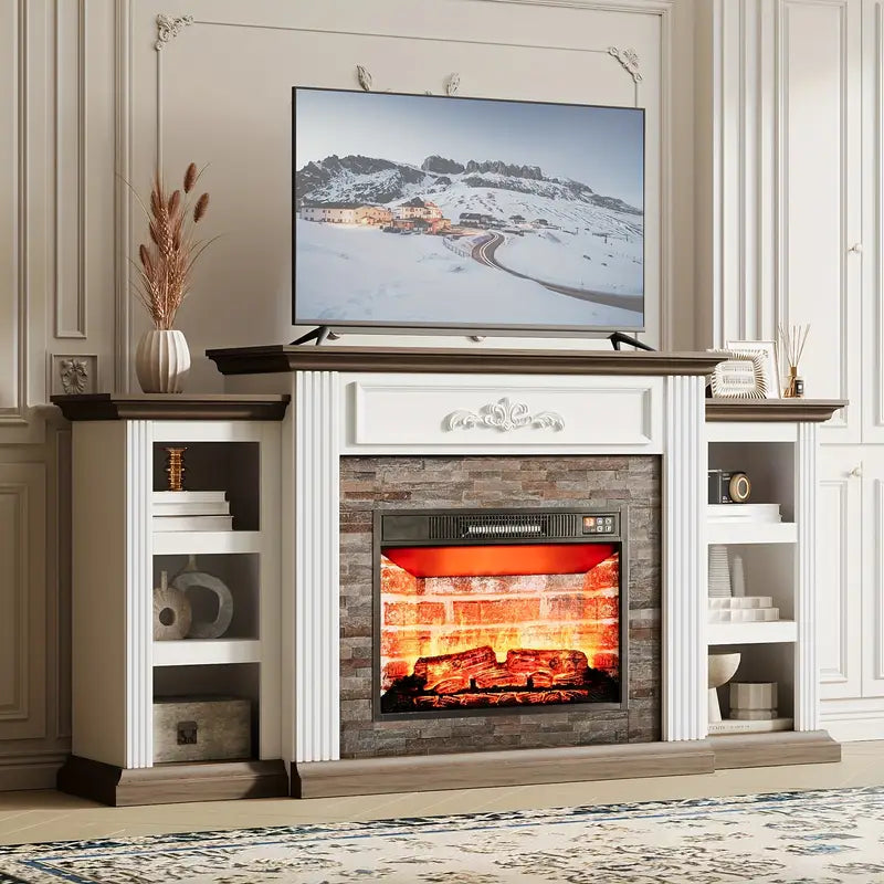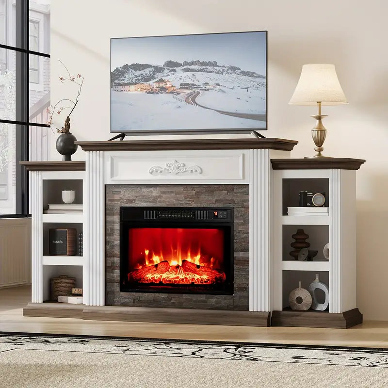 The white and brown finish offers a clean, versatile palette, while open shelving and concealed cabinets provide ample media storage. Remote control functionality, timer settings, and a 1400W heater ensure comfort and convenience. Designed to support TVs up to 80", this piece anchors your space with understated elegance and practical luxury.