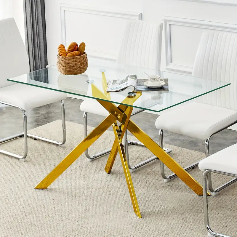 Classic Rectangular Glass Dining Table - Clear Tempered 51.18" with Golden Metal Legs