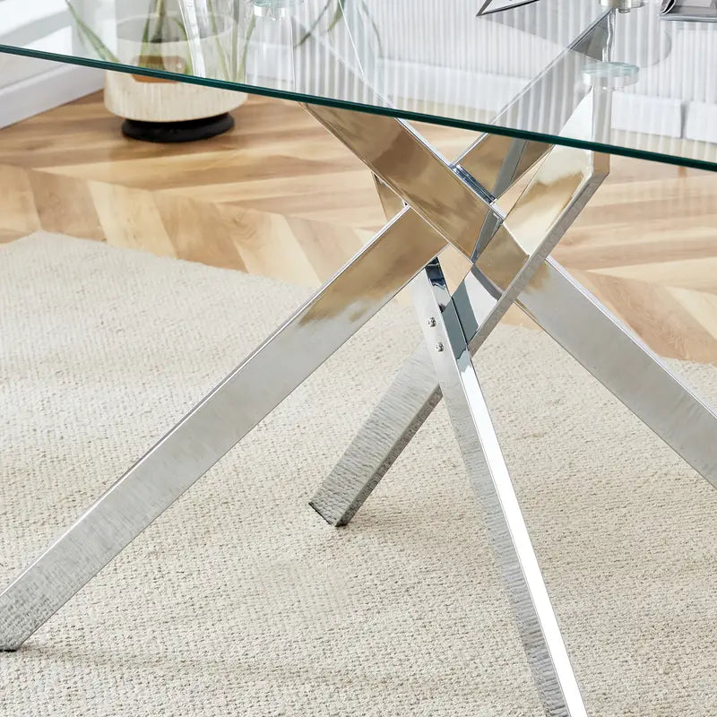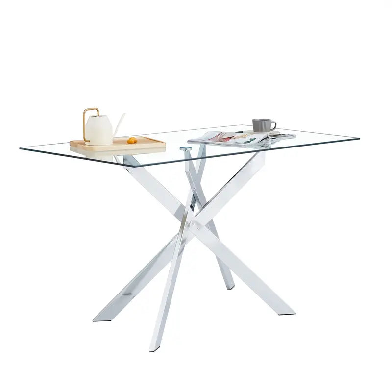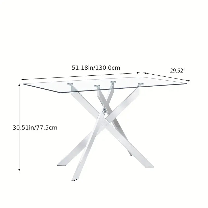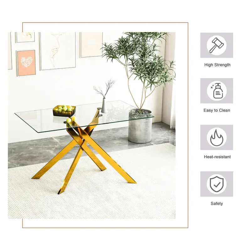 This classic rectangular glass dining table features a clear tempered glass top measuring 51.18 inches, paired with elegant golden metal legs. Its space-saving design is ideal for contemporary dining rooms, offering both style and functionality. Delivered pre-assembled, it requires no electricity, making setup effortless and convenient. Perfect for those seeking a sleek, durable dining solution with a modern aesthetic.