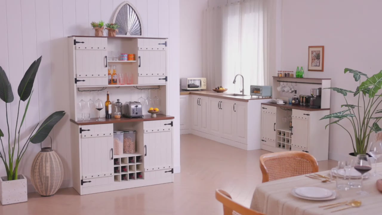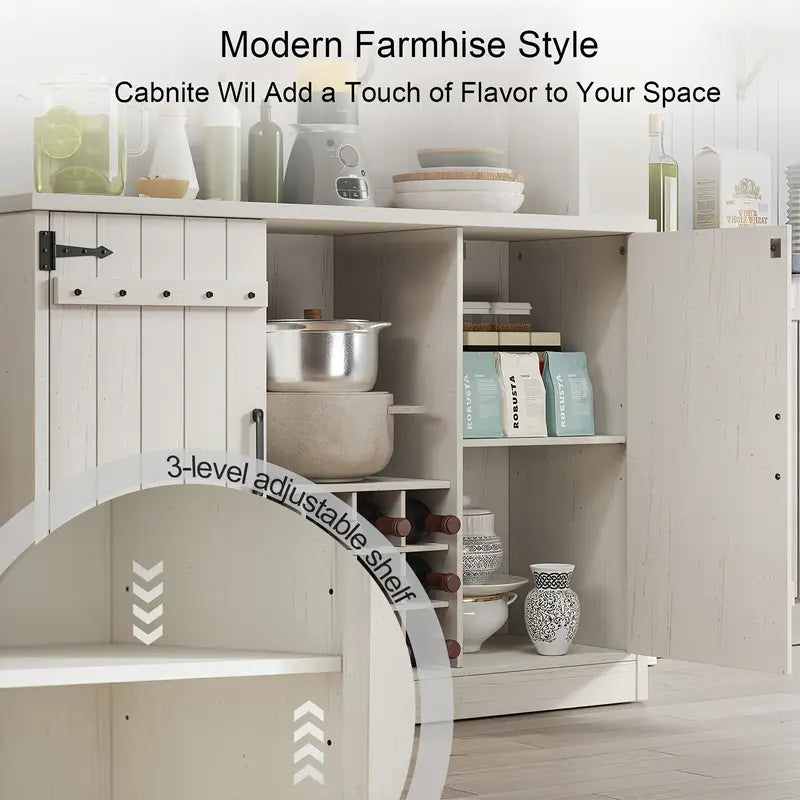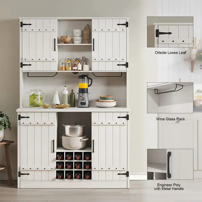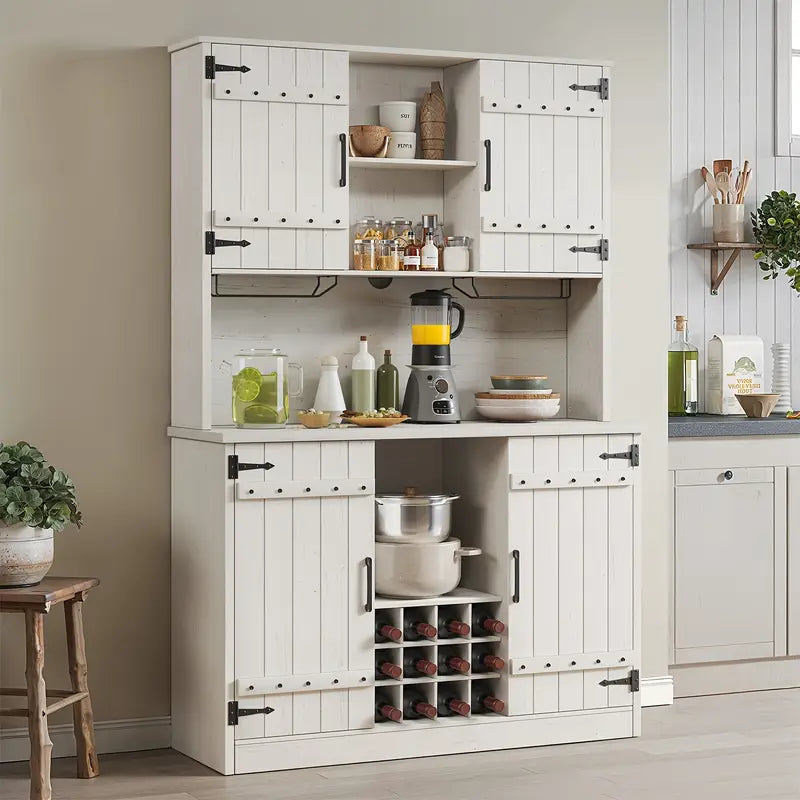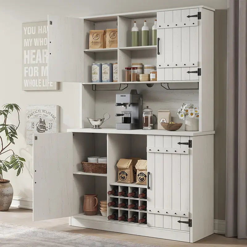This 71.1-inch farmhouse kitchen pantry combines rustic charm with practical design, featuring adjustable shelves for customizable storage. It includes drawers for organizing essentials and a built-in wine rack, making it ideal for both kitchen and dining room use. Finished in off-white, this versatile cabinet enhances your space with ample storage while maintaining a classic farmhouse aesthetic.