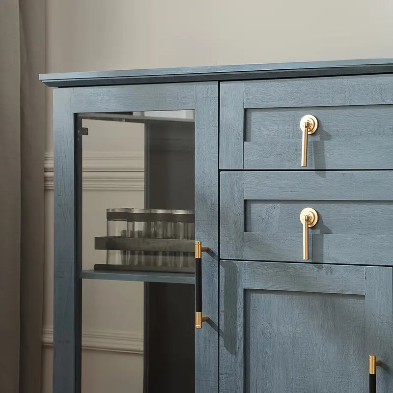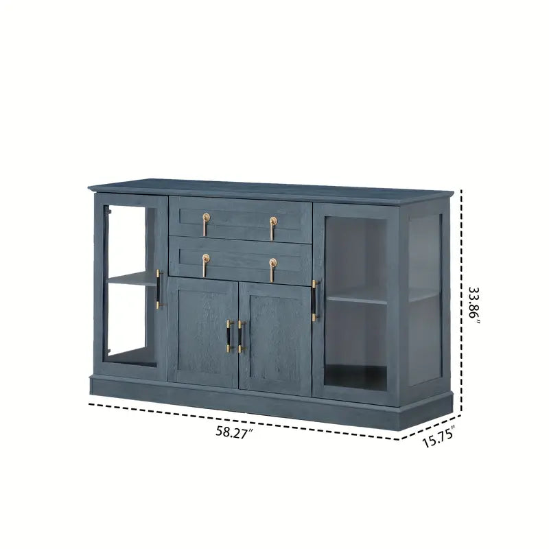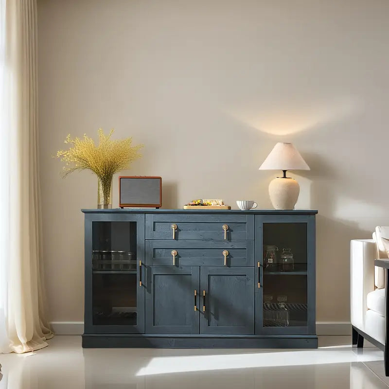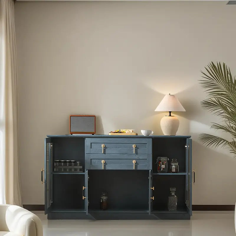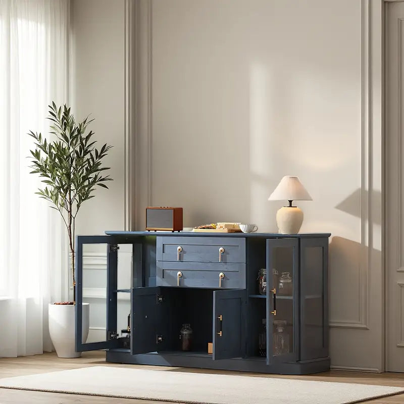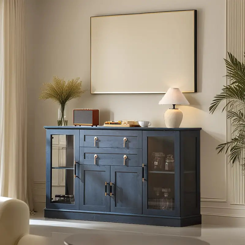 Elevate your dining experience with this Large Sideboard Cabinet—a statement piece that merges contemporary sophistication with natural allure. Finished in a rich deep ocean blue, this spacious sideboard features framed glass doors that reveal a curated interior of adjustable shelving, ideal for storing elegant dinnerware, artisanal serve ware, or design-forward décor.