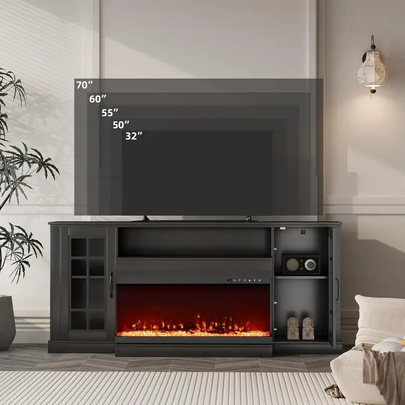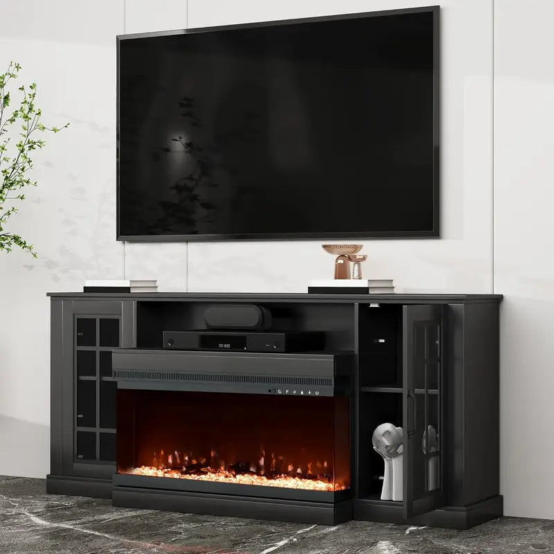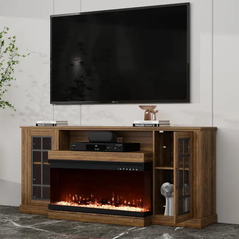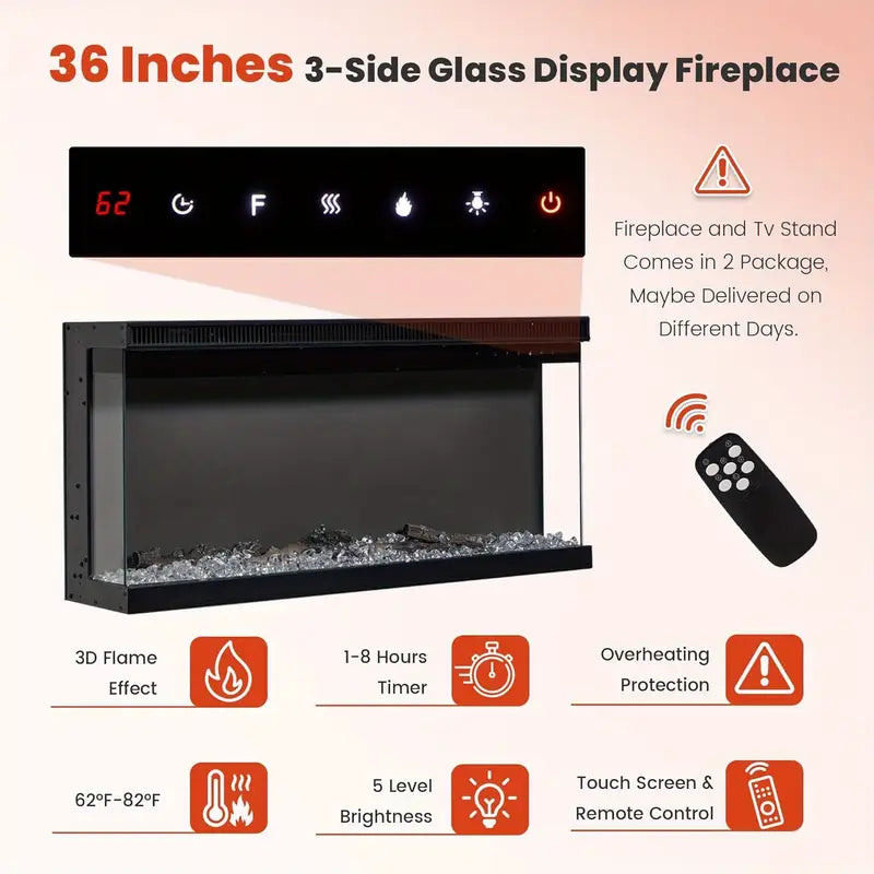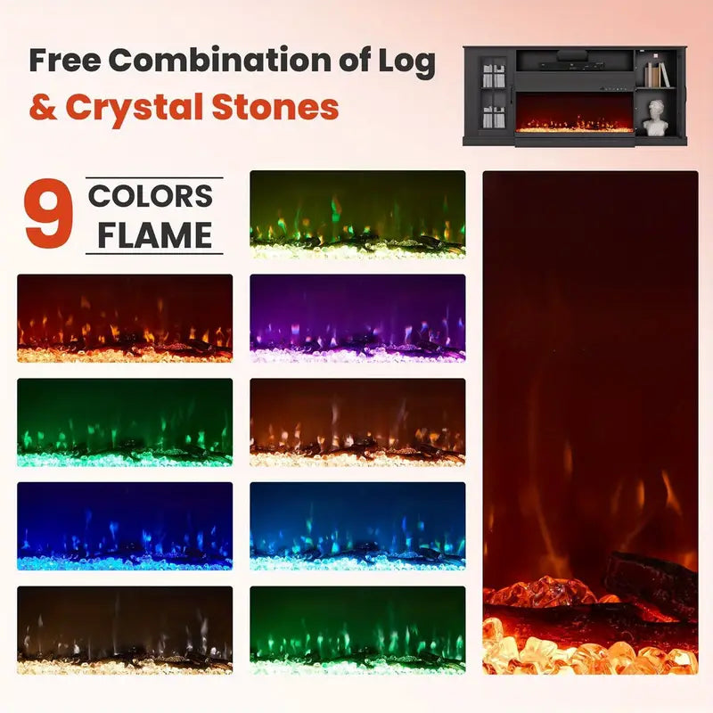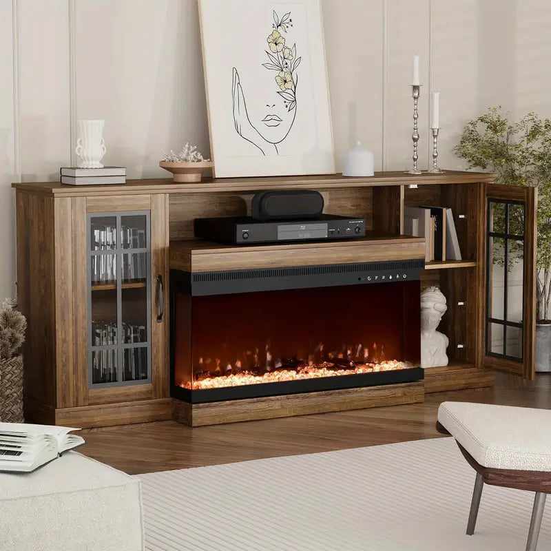 Experience the perfect fusion of modern convenience and timeless charm with this sophisticated entertainment center. Featuring a panoramic three-sided electric fireplace, it offers mesmerizing flame views from every angle, customizable with lifelike wood logs or crystal stones, nine color options, and five brightness levels to create the perfect ambiance. Its rustic farmhouse design is enhanced by traditional barn doors and sleek organic glass accents, adding elegance and warmth to your living space. Thoughtfully designed with intelligent, spacious storage, it keeps your essentials organized while elevating your home’s style.