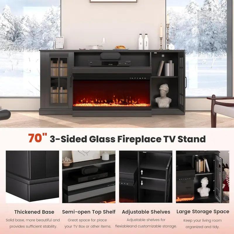3 Sided Entertainment Center for 80 TVs, Black Media Console with Transparent Storage Door.