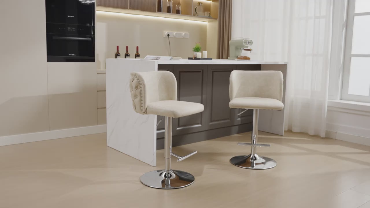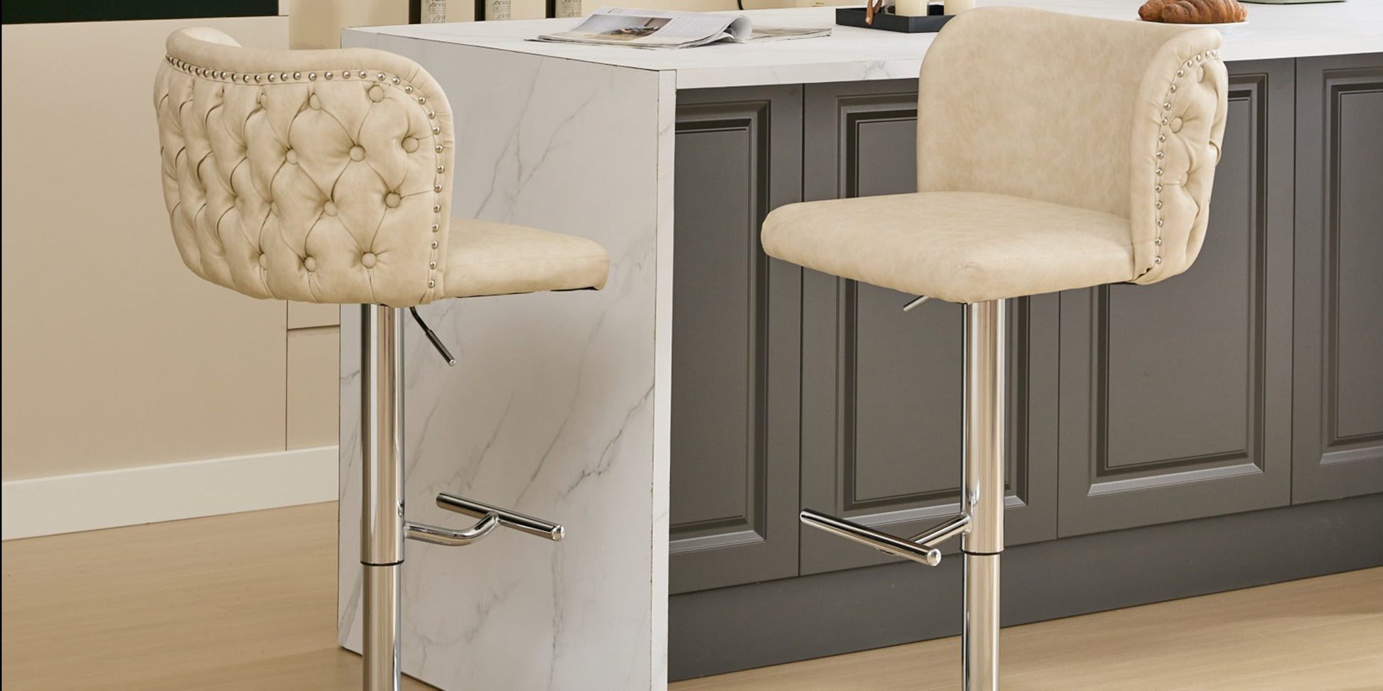 Bring timeless charm and tailored comfort to your kitchen or pub space with this set of two height-adjustable bar stools, designed to balance sophistication with everyday functionality. Upholstered in soft beige faux leather, each stool features a button-tufted wingback silhouette, accented by nailhead trim for a touch of heritage detail.