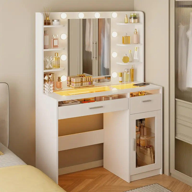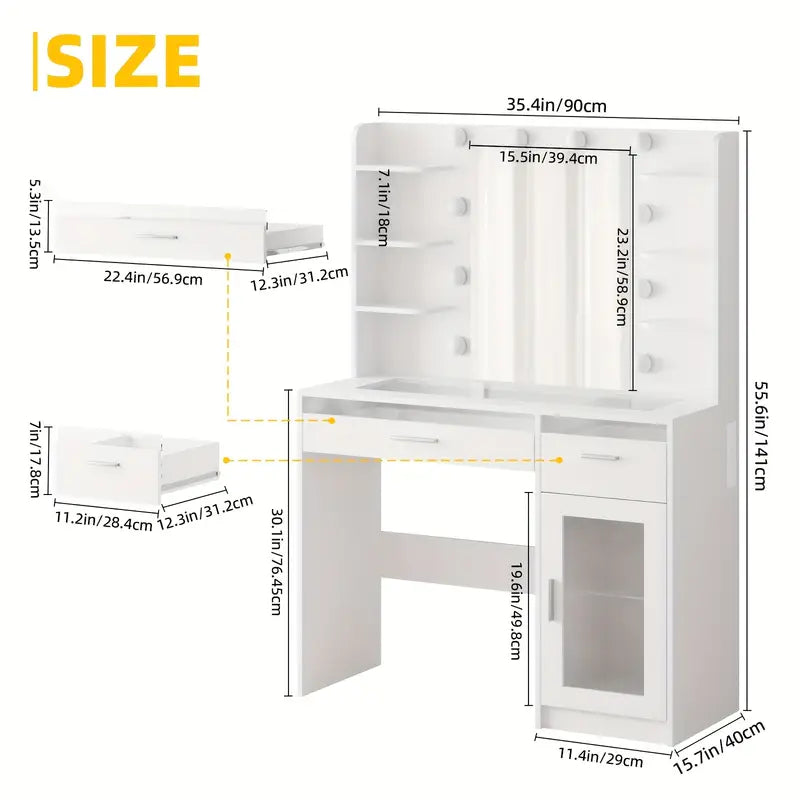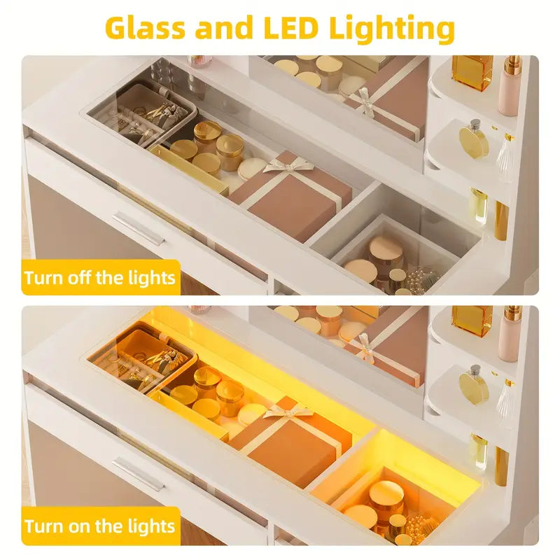 • Elegant Storage Solutions: Two smooth-gliding drawers and six open shelves provide ample space for cosmetics, skincare, and accessories, all organized with effortless grace.