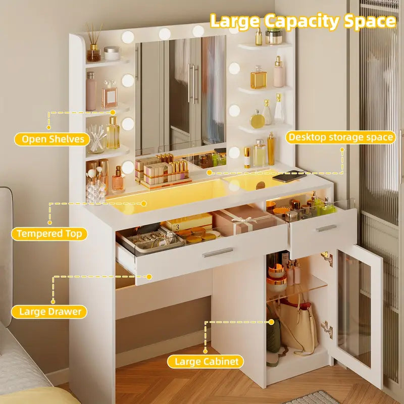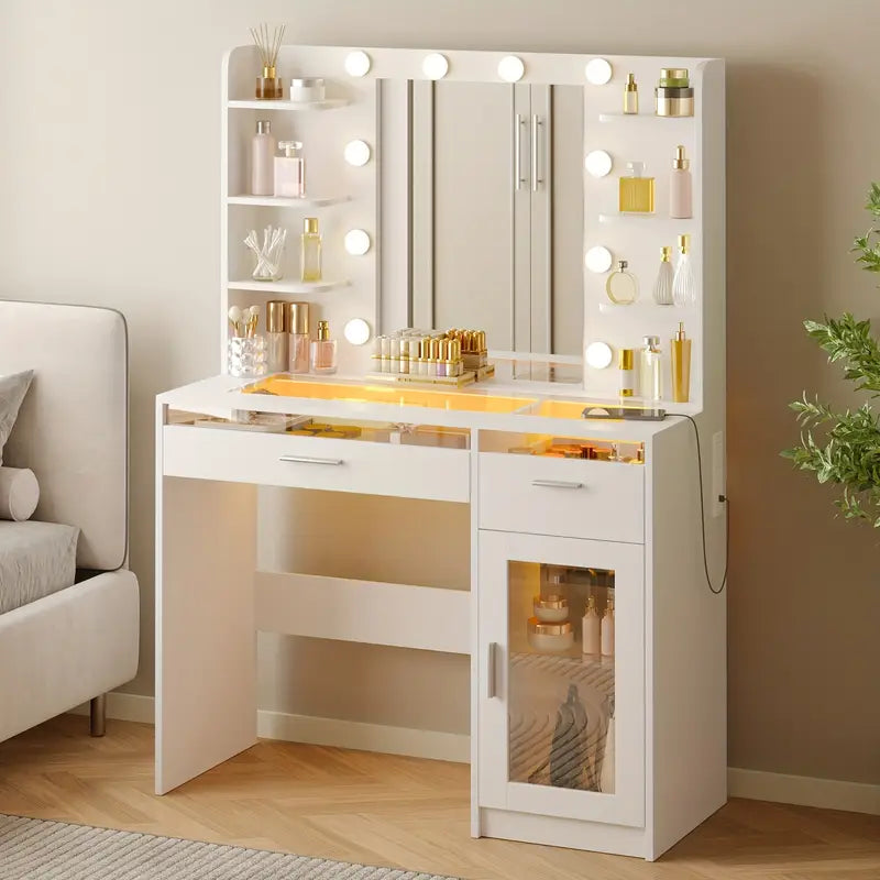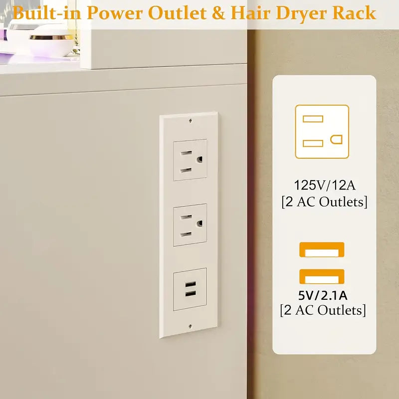 • Integrated Power Strip: Seamlessly charge your devices or plug in styling tools with the built-in power outlet, keeping your beauty essentials within reach and clutter-free.