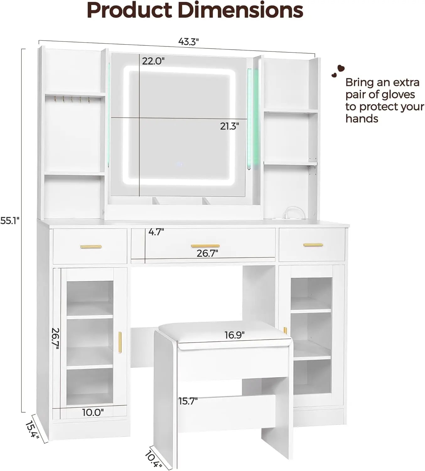 Illuminate your beauty ritual with the LunaGlow Vanity—where modern elegance meets intelligent design. Featuring ambient RGB lighting that syncs with your music, adjustable HD mirror modes, and app-controlled brilliance, this vanity transforms daily prep into a luxurious experience.